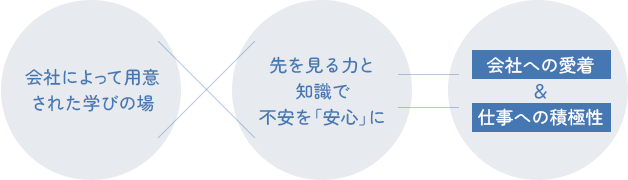 そのため、会社が用意した「学びの場」で自分のキャリアと仕事・ライフについて納得いくまで考え、学ぶことが重要です。本講座では長期的キャリアビジョンを持たせるだけでなく、「マネジメント思考」で経営思想を身に付け「自分」ではなく「社員」として会社に貢献する意義・思考をしっかりと定着させることができます。