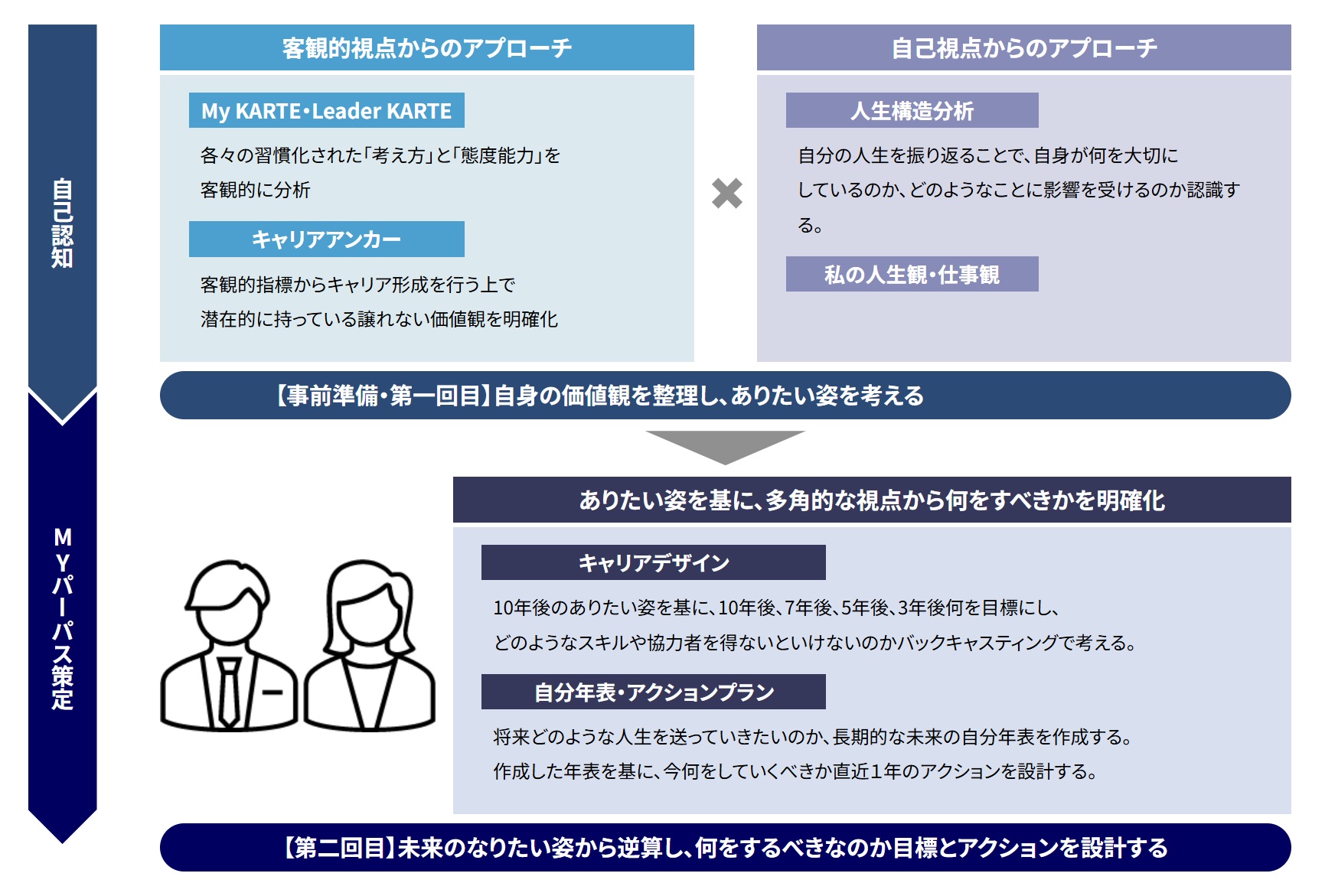 研修で考えた自分自身の将来のMYパーパスを基にアクションプランを設計し、来期中に達成できる内容設計し、各回の研修で振り返りを実施します。