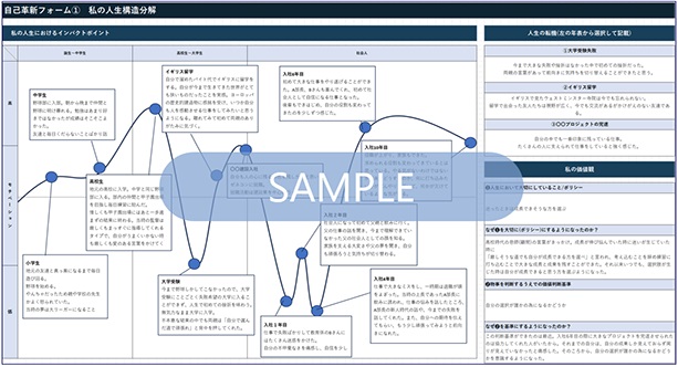 - 10年後の「未来年表」 を作成し、未来のありたい姿から逆算して思考。策定したMYパーパスを実現するため、直近1年で実行すべき「アクションプラン」 へと具体化