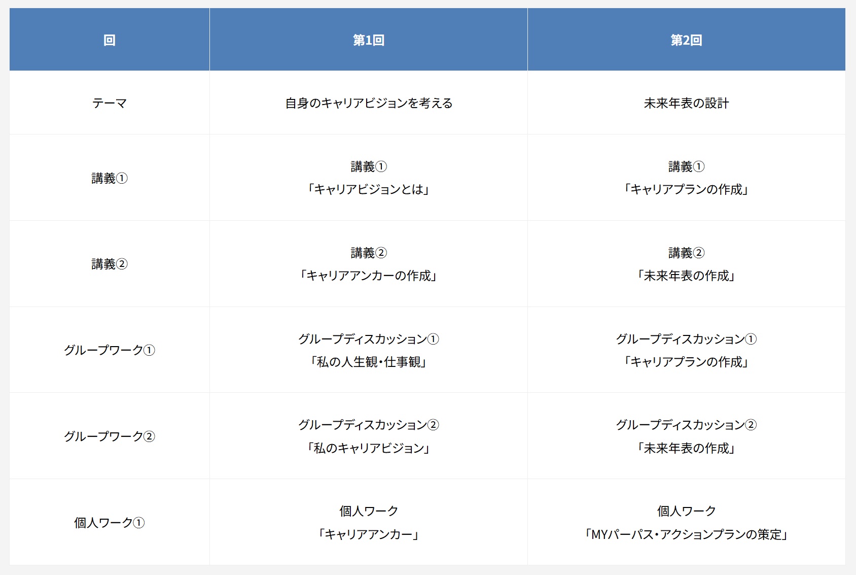 キャリアビジョン研修では2日に分けて、自らの価値観を整理し、将来のキャリア像と実現に向けたアクションプランを作成します。