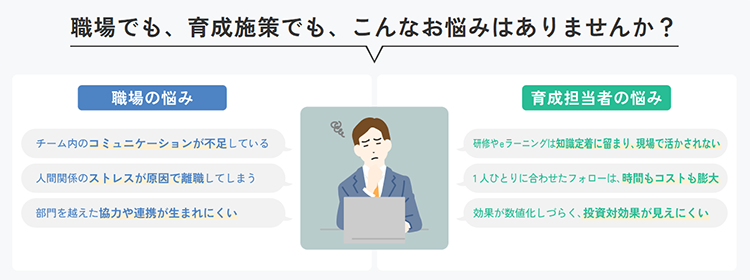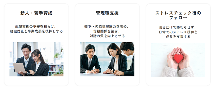 - 新入社員や若手社員のコミュニケーション不安軽減、管理職の部下指導スキルや感情理解力の向上、部門間の摩擦軽減、ストレスチェック後のフォローなど、あらゆる対象や状況に効果があります。