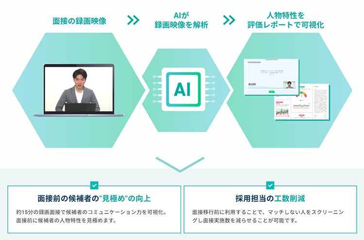 そのため、本サービスを低コストでご提供できるとともに、録画内容を事前に確認することで1次面接に役立てることができます。