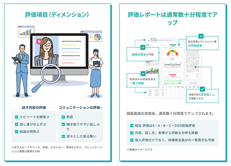 - 内容評価項目と、コミュニケーション評価項目による多角的分析により、「自社に合う人材か」を可視化できます