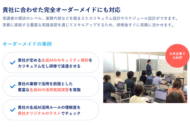 - 実務での活用をゴールに置いたAI研修を提供します。実践演習を交えながら学習するため、研修後すぐに業務活用が進むことが期待できます。