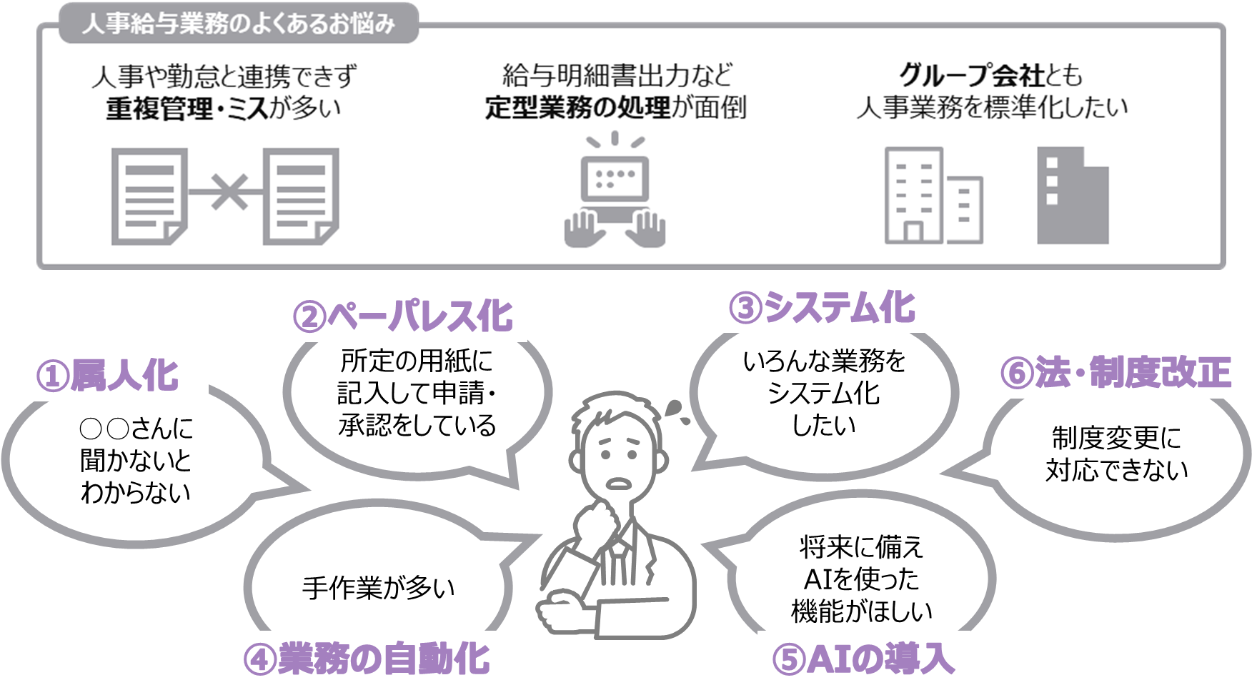 人事・労務・総務を兼任し、日々のルーティンを回すだけで精一杯。改善やDXに時間を投じる余裕がなく、“運用を維持するだけで限界”という状態になりがちです。