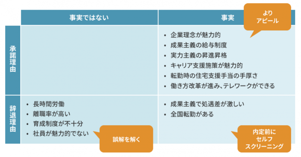 一方で、事実でない辞退理由(例:長時間労働の誤解など)があれば、正しい情報を伝える施策を講じる必要があります。具体的には、働き方改革に関する取り組みや制度変更などの詳細な情報を発信することで、過去からの変化のアピールに繋がります。