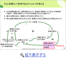 次に、これをさらに深堀していきます。研修を強化すれば何がおこるでしょうか。研修内での基準(外部基準)が強まり、現場の基準と乖離すれば乖離するほど、現場の人たちの反応は悪くなるでしょう。そのため、現場に早くなじみたい新入社員たちは、現場の人と同じ行動をとるようになることがわかります。「現場で基準にしていることへの合致度」がボトルネックであることがわかるのではないでしょうか。