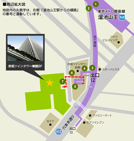 | 道路を挟んで向い側が赤坂ツインタワー東館の入口です。入口を入ってすぐ右側にエレベーターがありますので、8階まで上がってください。 | ![]() |
